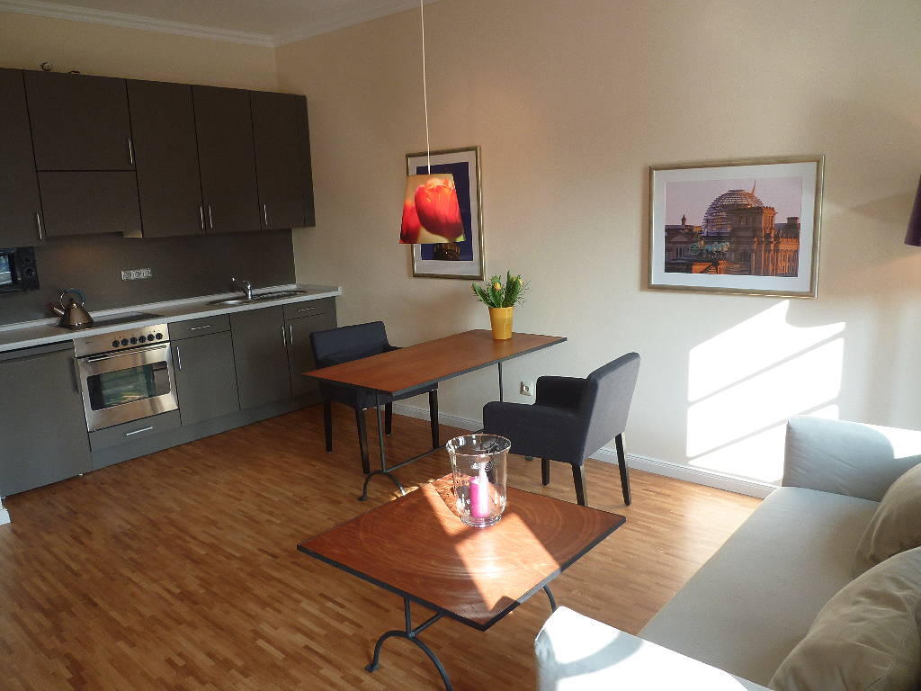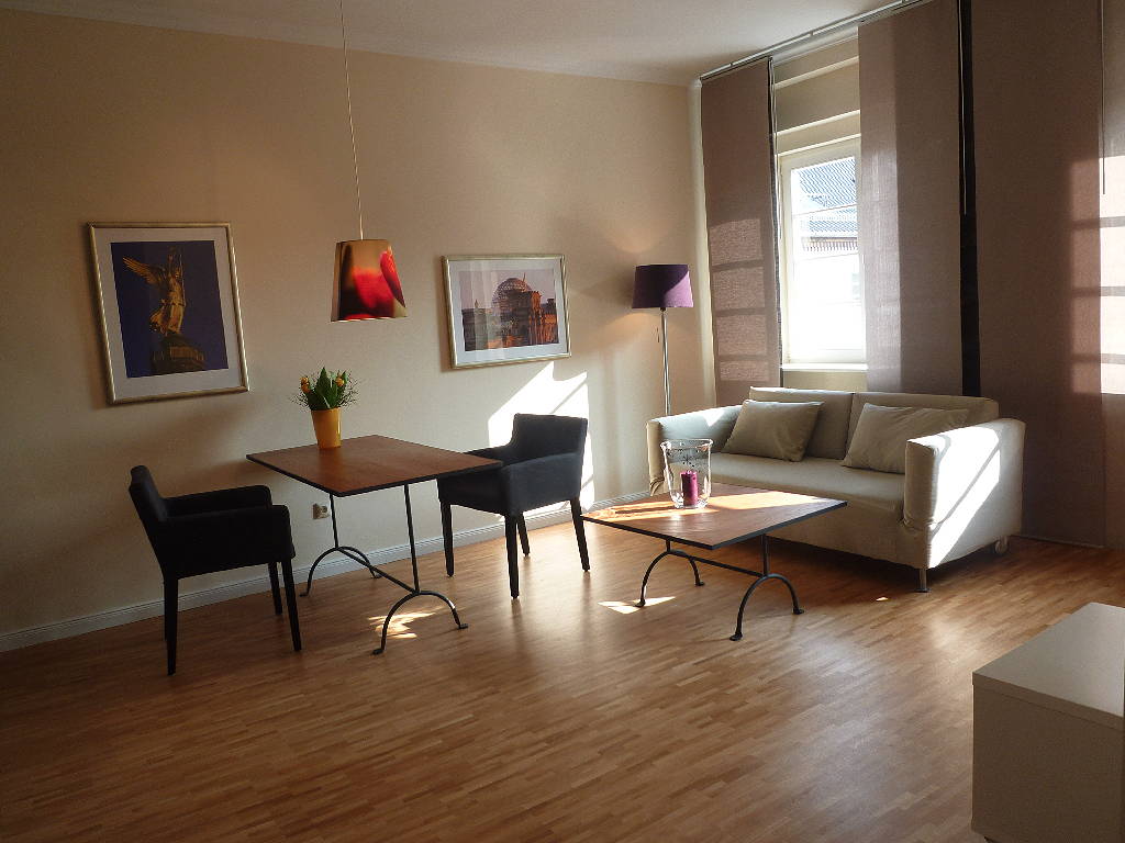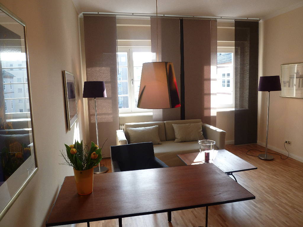 Neu und modern gestaltetes Apartment, offene Küche mit vorgelagertem Essplatz, separater Schlafbereich, Duschbad, Diele, Parkett, 4. OG mit Fahrstuhl. Im Mietpreis ist der wöchentliche Wäsche- und Reinigungsservice enthalten. |