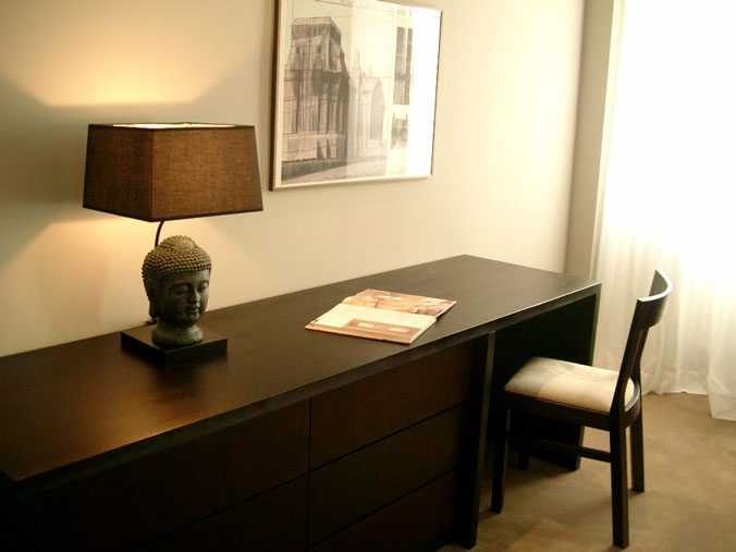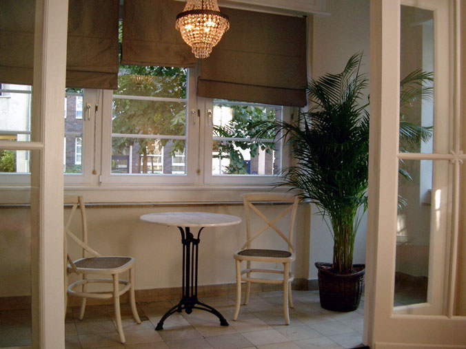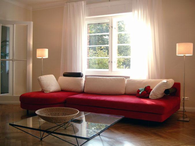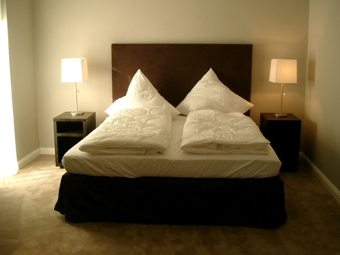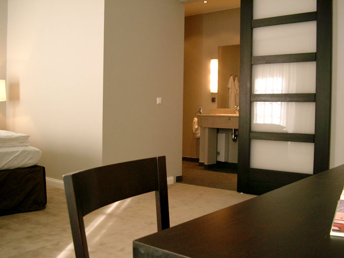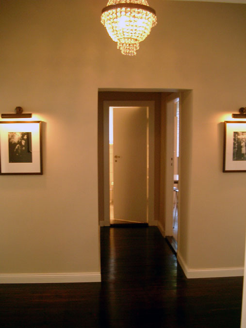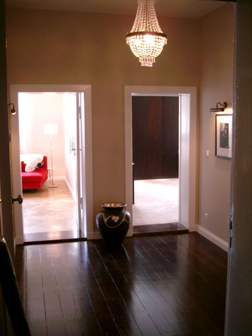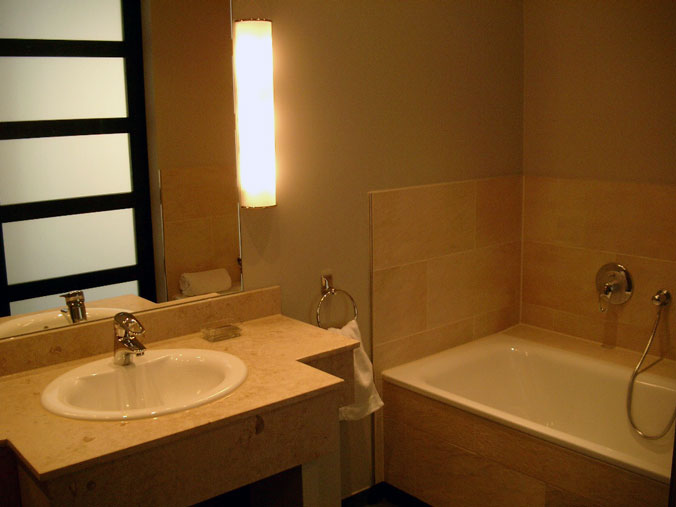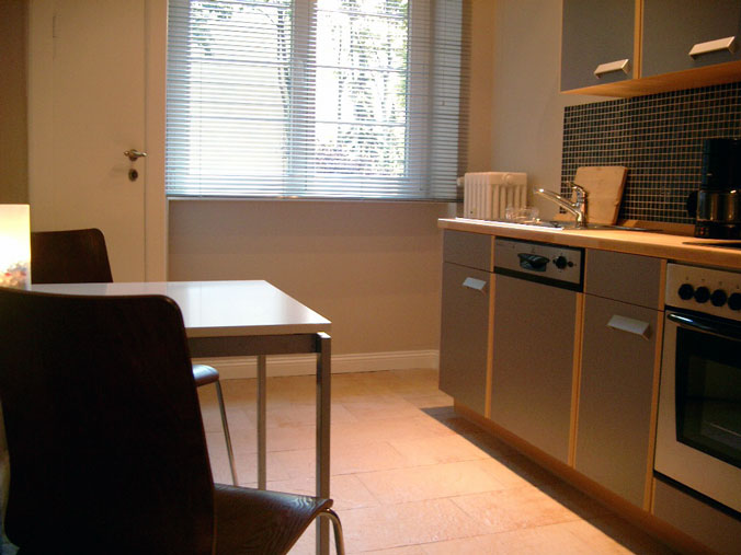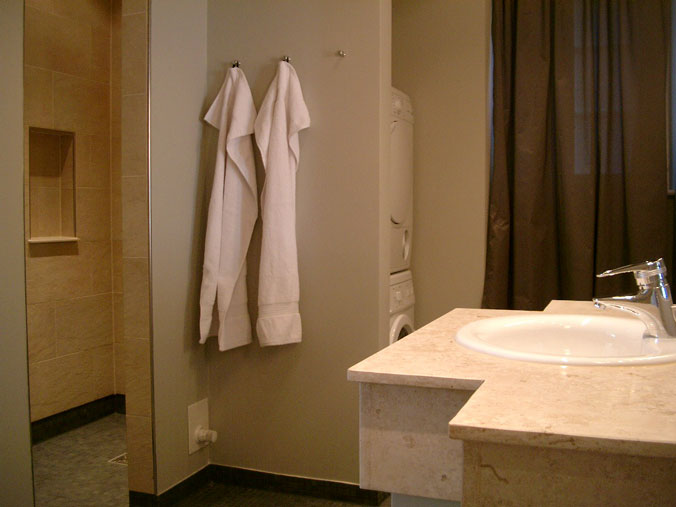 - Bad Blick Richtung Dusche, hinter Trennwand die Waschgeräte