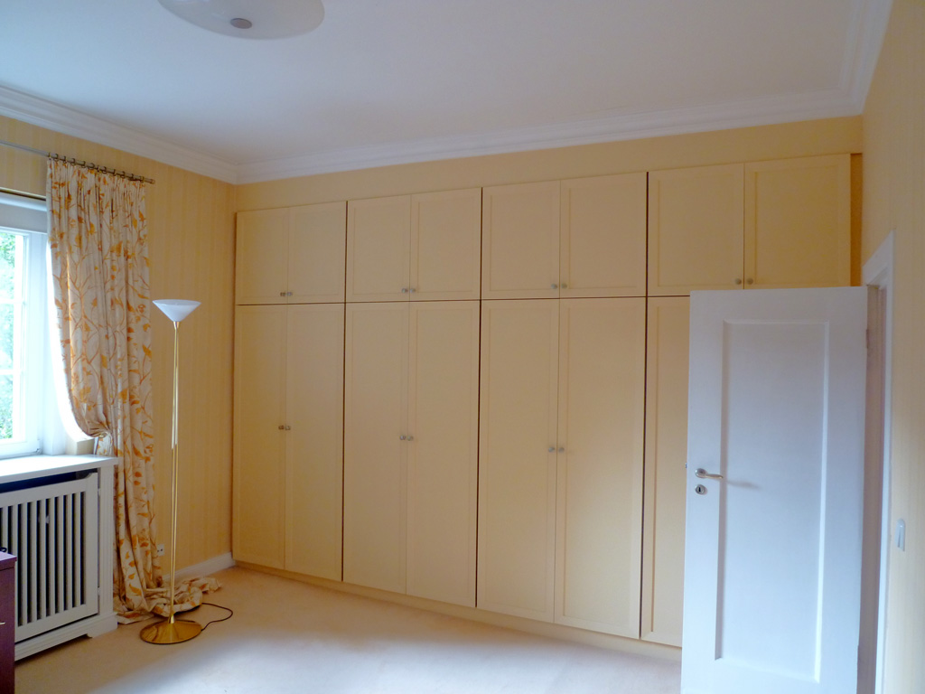 Im Schlafzimmer sorgen Einbauschränke auf beiden Seiten für ausreichend Stauraum.