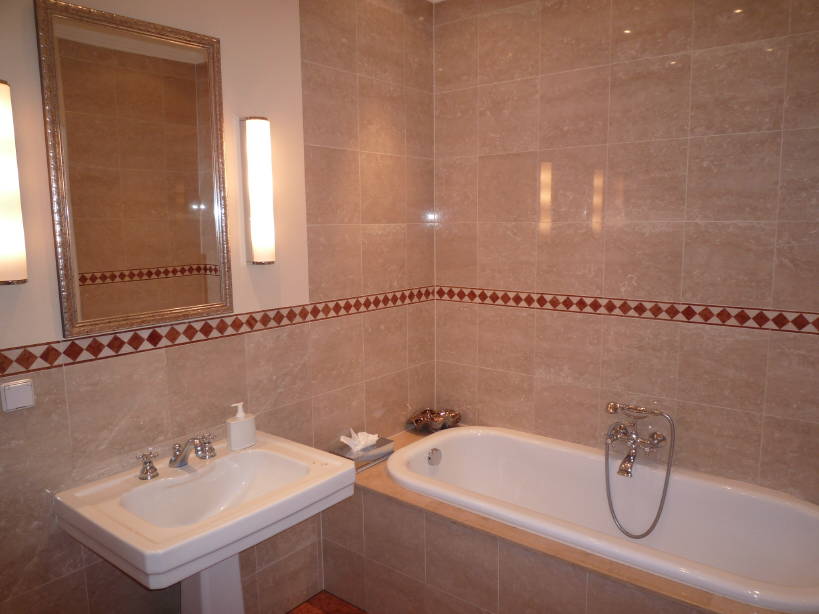 Im Badezimmer dominieren die die beiden Marmorsorten und harmonieren mit den klassischen Objekten Badewanne, Waschtisch und WC.