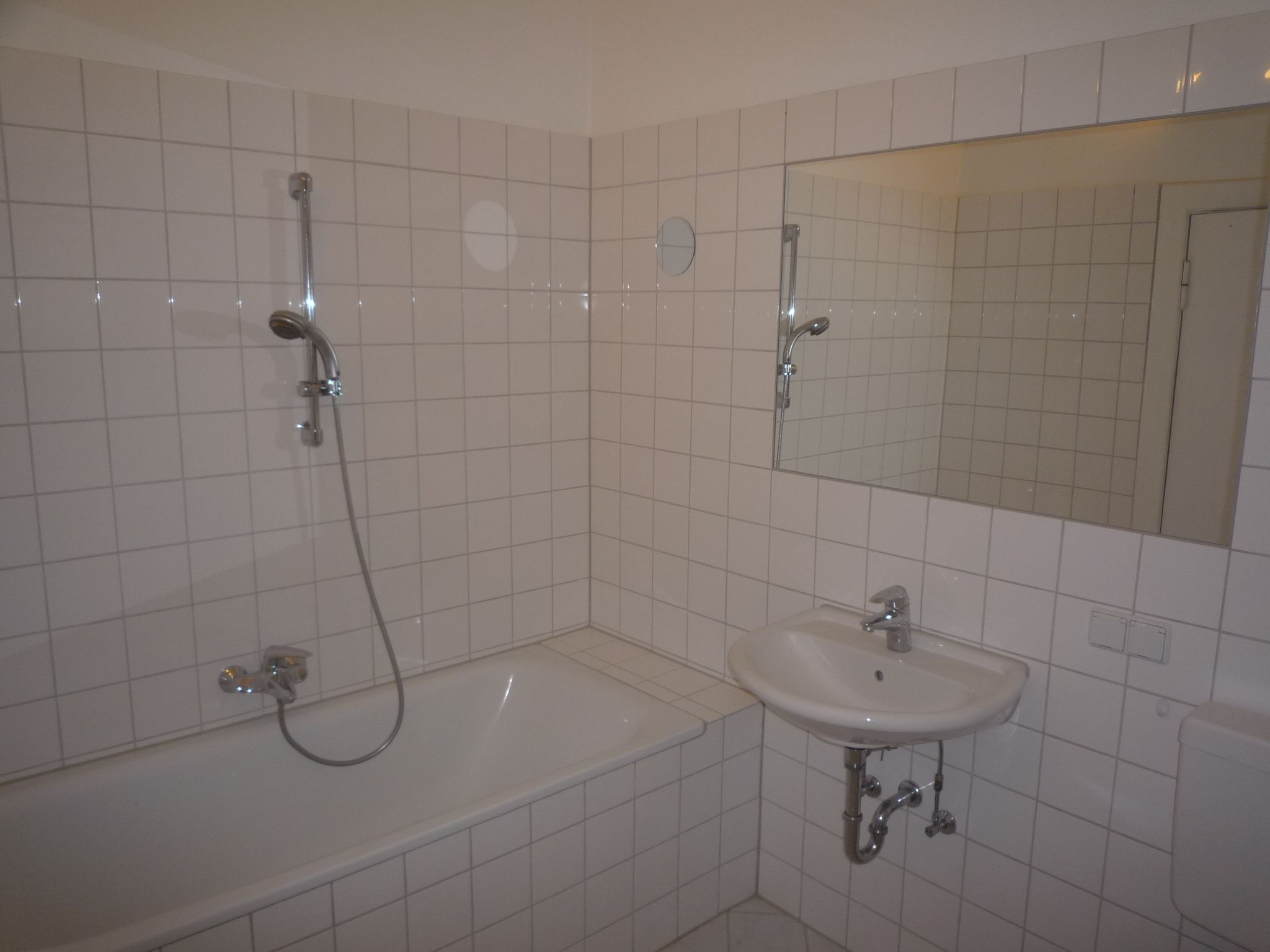Das Badezimmer mit Badewanne ist weiss gefliest und hat einen eingelassenem Wandspiegel.Zusätzlich gibt es separates Gäste-WC.
